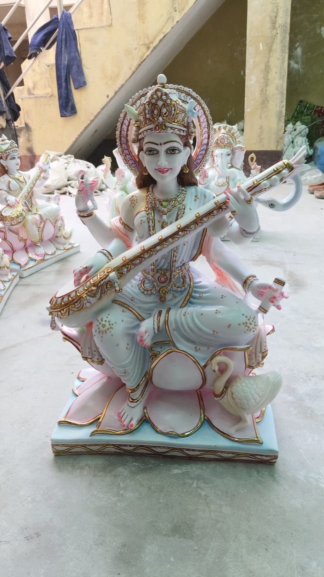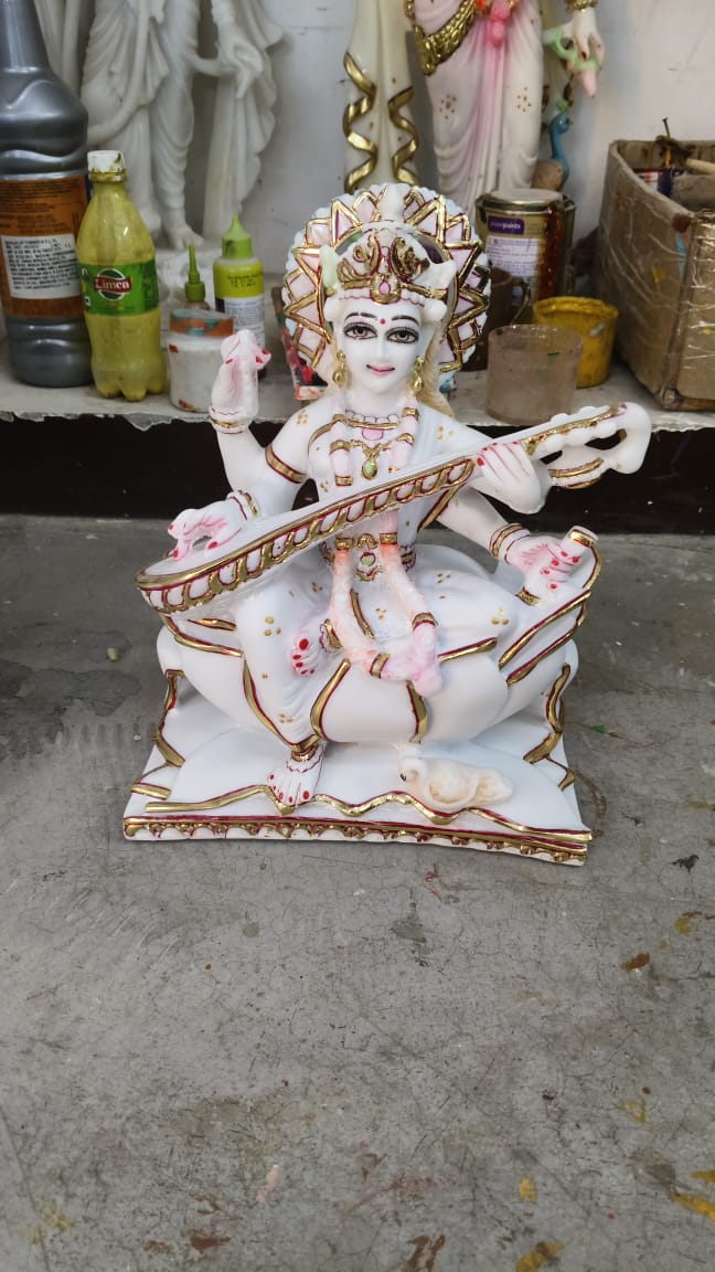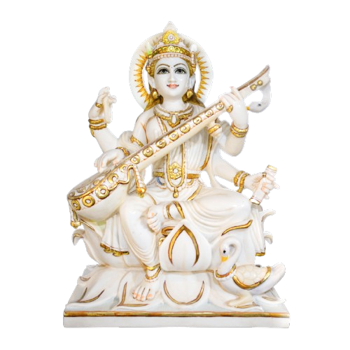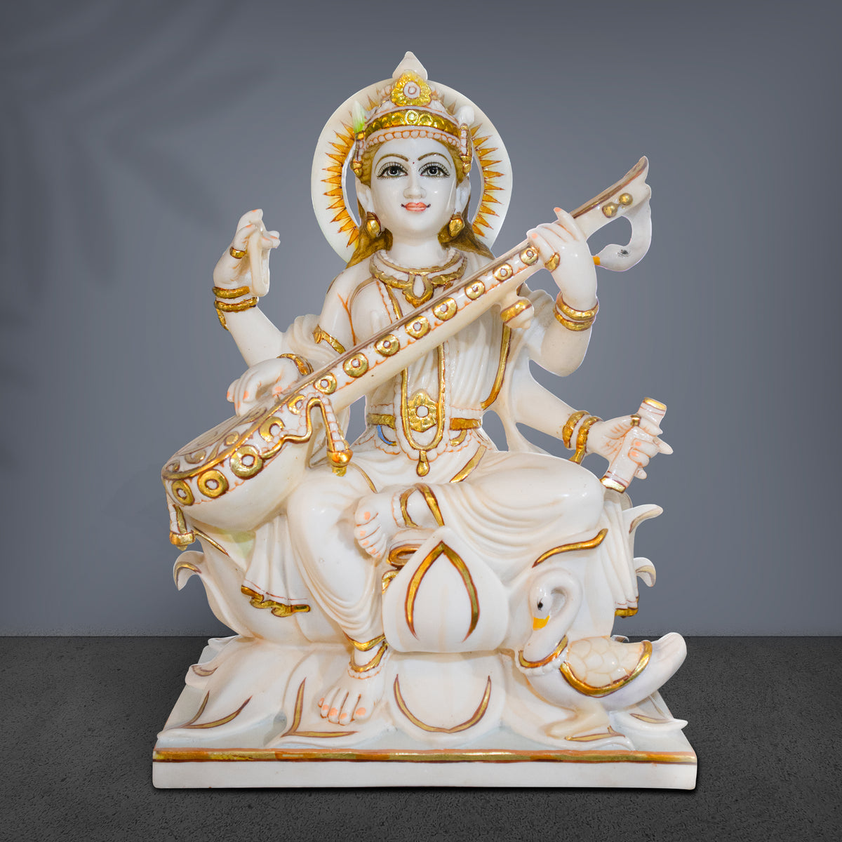 Finish: It is meticulously hand-carved by skilled artisans (often from Jaipur/Rajasthan) and finished with a high polish, giving it a smooth, luminous, and elegant appearance. While often kept entirely white, many murtis feature delicate gold leaf or multi-color painting to accentuate the jewelry, Veena, and garments.