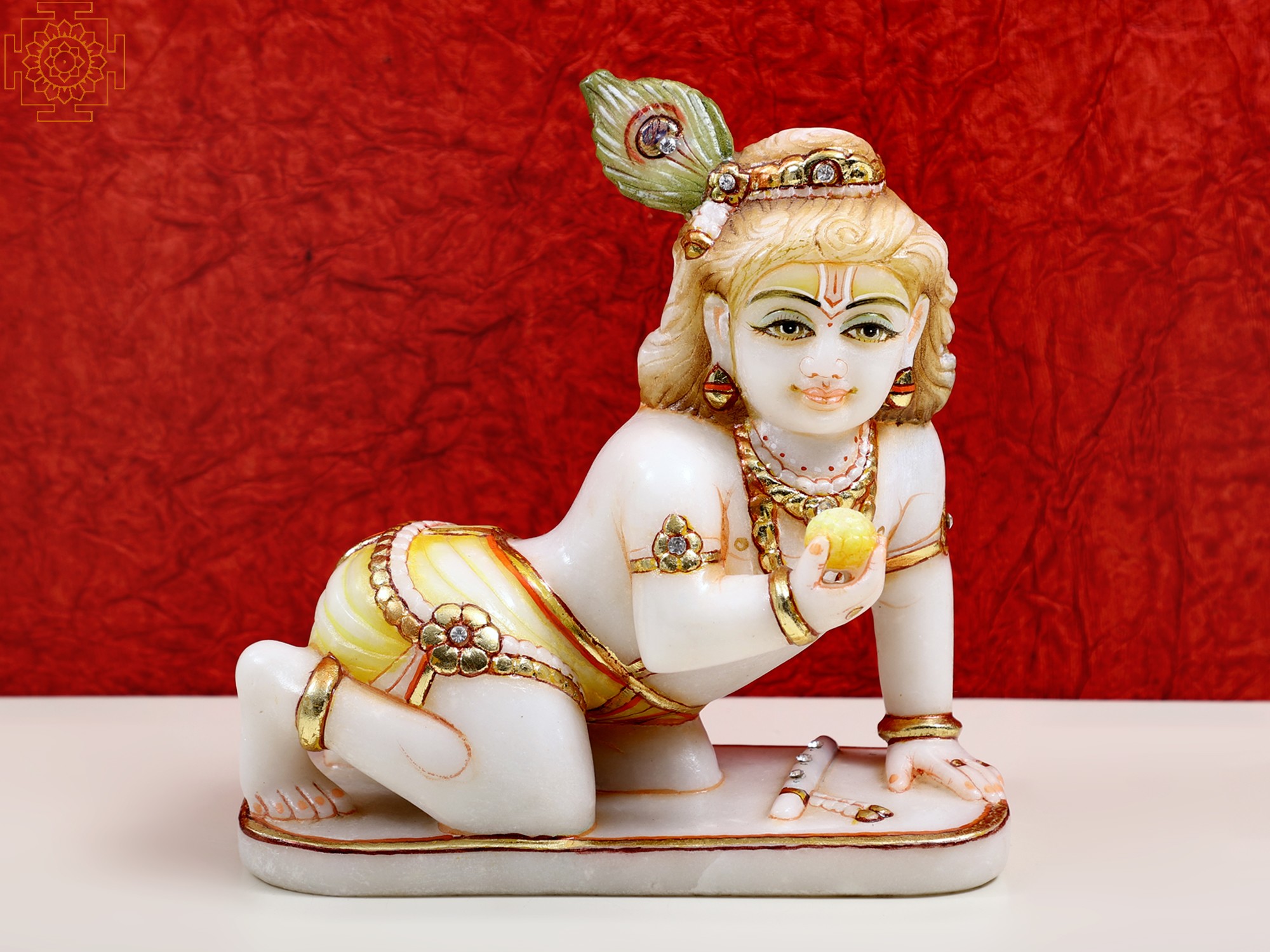 Deity & Pose: The statue depicts Lord Krishna in his beloved childhood form, crawling on his hands and knees. This pose, often referred to as Laddu Gopal or Bala Krishna, symbolizes innocence, joy, and the eternal bliss of the Lord.